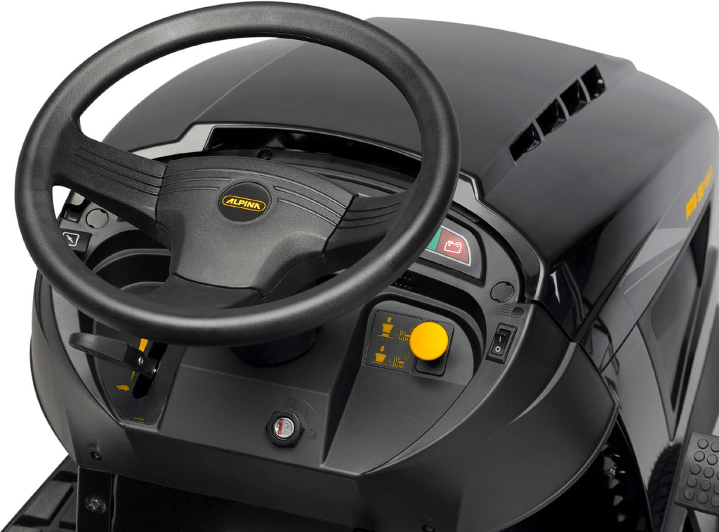 Mit leistungsstarken und gut ausgestatteten rasentraktor Alpina AT6 102 HWA erledigen Sie mühelos umfangreiche Arbeiten im Garten.
