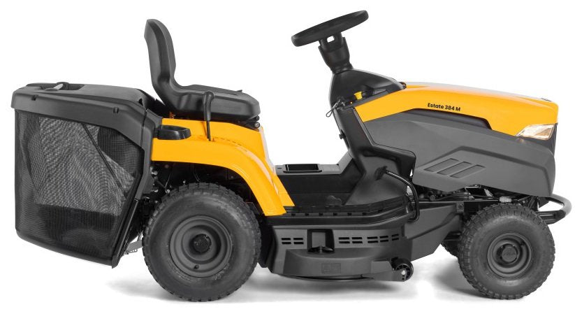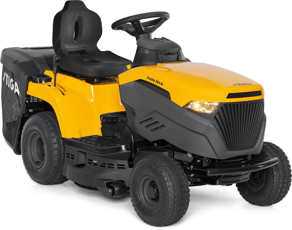 Der Rasentraktor STIGA Estate 384 M ist ausgestattet mit einem ST 400 Powered by STIGA Benzinmotor mit einer Nennleistung von 5,8 kW bei 2400 U/min. Dieser Gartentraktor verfügt über ein Schaltgetriebe mit 5 Vorwärtsgängen und 1 Rückwärtsgang, einen 200 Liter Heckfangkorb und ein erhöhtes ergonomisches Lenkrad für komfortables Fahren. Bei dem 84 cm breiten Mähdeck mit zwei Messern lassen sich 7 verschiedene Schnitthöhen zwischen 25 und 80 mm auswählen. Die praktische elektromagnetische Messerkupplung wird per Tastendruck gesteuert.