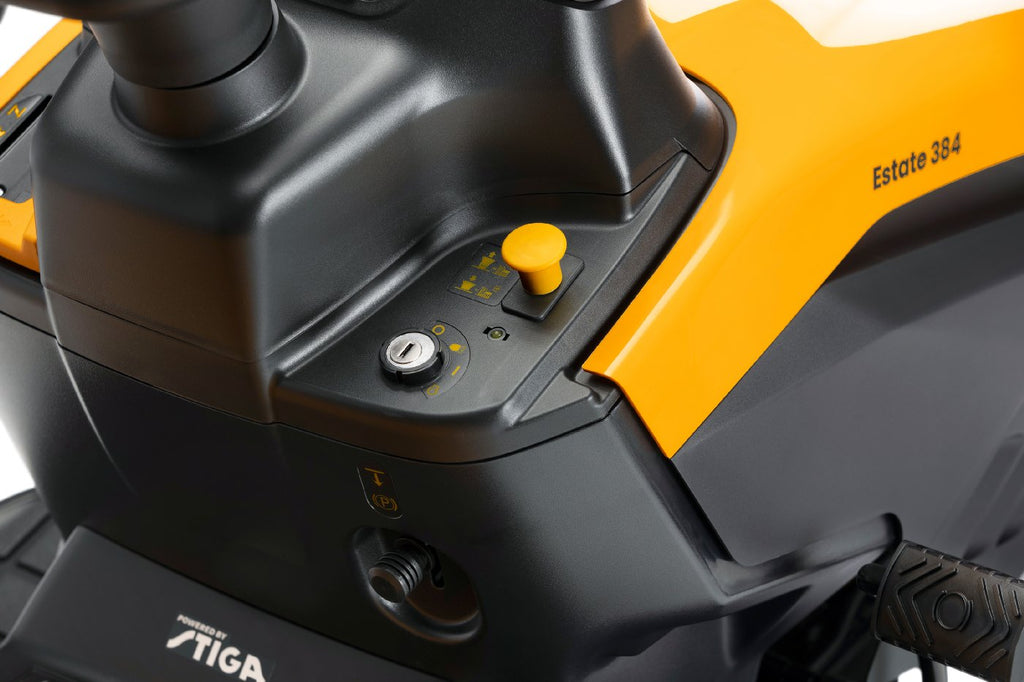 Der Rasentraktor STIGA Estate 384 hat eine Nennleistung von 6,8 kW bei 2400 U/min. Der Mäher ist mit einem pedalgesteuerten stufenlosem Hydrostatantrieb ausgestattet, der eine gleichmäßige Regelung der Fahrgeschwindigkeit ermöglicht, ohne dass der Gang gewechselt werden muss. Bei dem 84 cm breiten Mähdeck mit zwei Messern lassen sich 7 verschiedene Schnitthöhen zwischen 25 und 80 mm auswählen. Die praktische elektromagnetische Messerkupplung wird per Tastendruck gesteuert. Der Estate 384 hat einen 240 Liter Fangkorb und kann auch mit dem STIGA Multiclip-Mulchkit zum Mulchen verwendet werden. Das erhöhte Lenkrad sorgen für ergonomisches, komfortables Fahren. Batterieladegerät und Mulchstecker sind separat erhältlich.